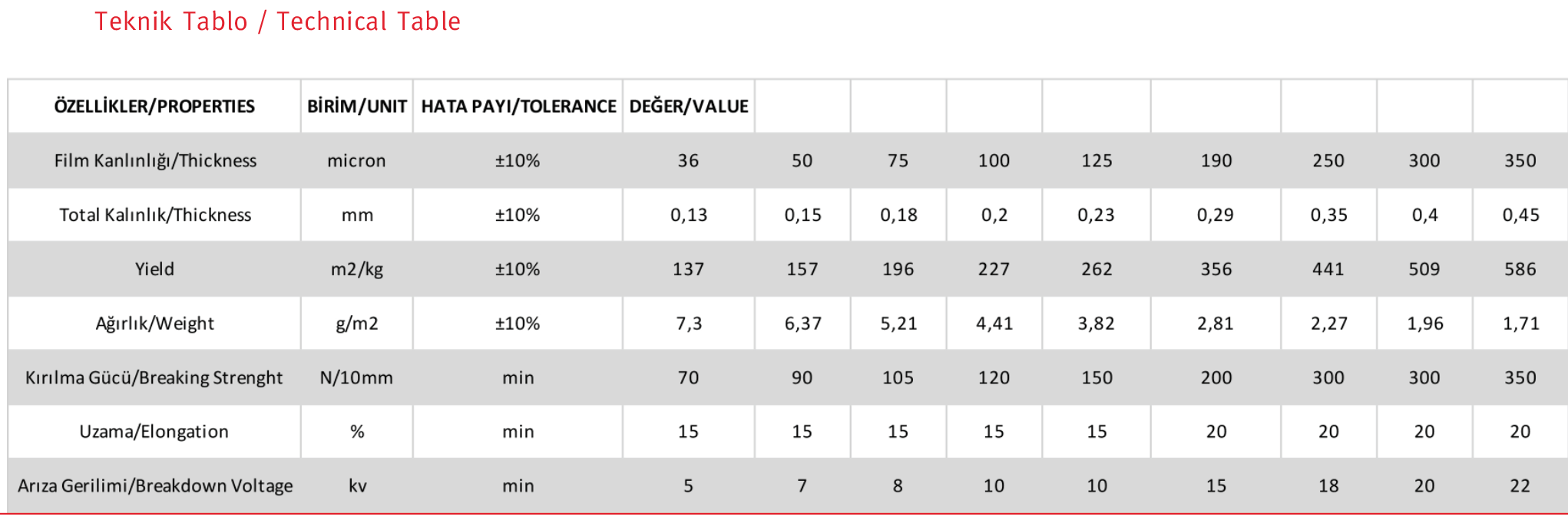 - Bileşim/Compound: It is a three-layer and resin-impregnated flexible electrical insulation material.