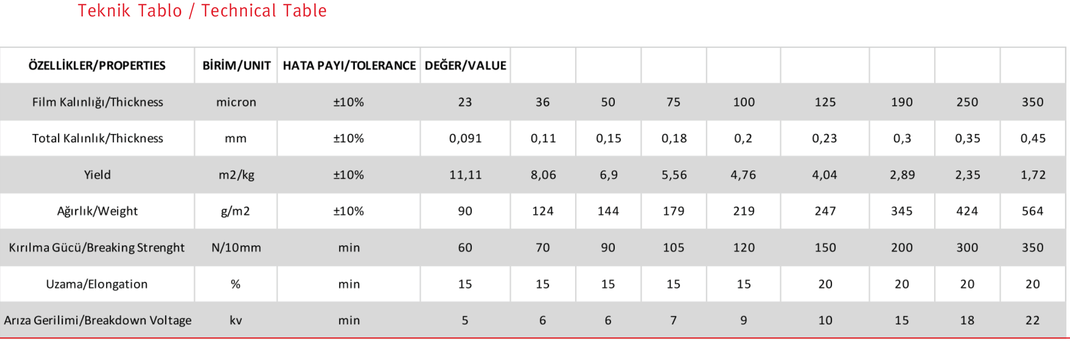 - Özellik/Feature: It is a three-layer flexible electrical insulation material.
