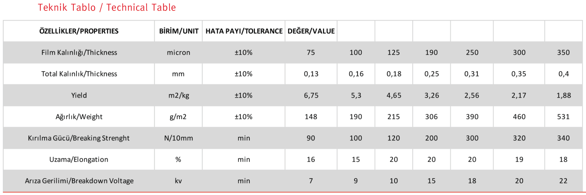 - Bileşim/Compound: It is a two-layer laminate, which is the PET film that yields the product.