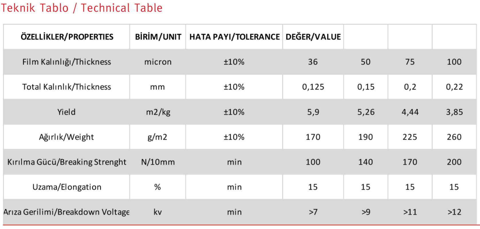 - Özellik/Feature: It is produced by laminating a film (36 to 100 µm) to two layers of resin-impregnated aramid paper (50/80 micron).