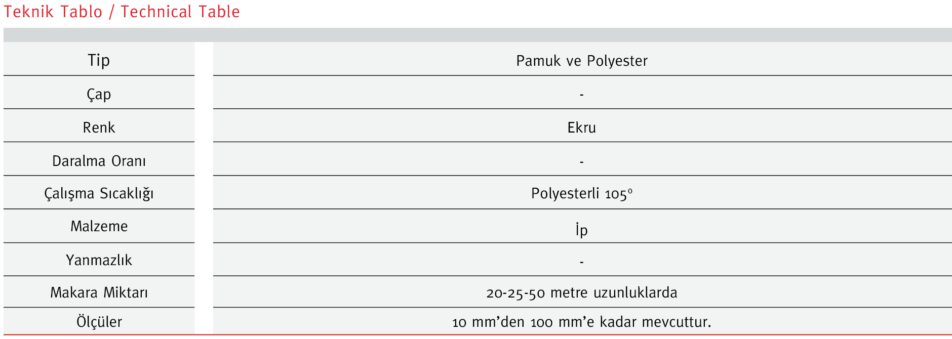 It is used in transformer coils, welding machine coils, motor windings, brake coils, to fix wire windings. After varnishing, a rigid coil is formed. Longer lengths can be produced upon request. It is produced from cotton yarn and polyester yarn.