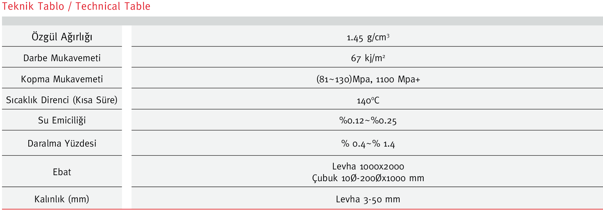 Mükemmel fiziksel, mekanik ve di-elektrik özellikleri mevcuttur. Her tür makineyle işlemeye uygundur. Mükemmel işlenebilirlik sağlar.