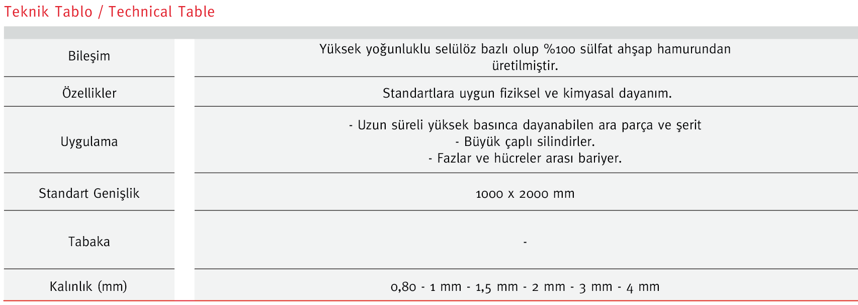 It is based on high density cellulose and produced from 100% sulfate wood pulp. It complies with the relevant standards physically and chemically. They are spacers and strips that can withstand long-term high pressure. It provides smooth surface, mechanical and electrical resistance, good temperature resistance for a long time. It has good mechanical strength property. It can be used in parts such as high electrical power, transformers, high currents and capacitors.